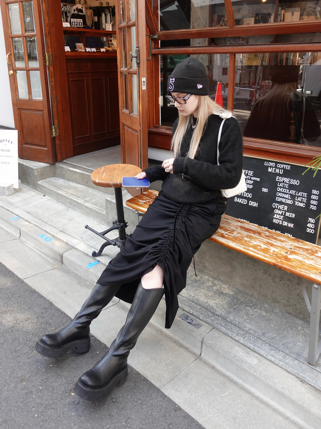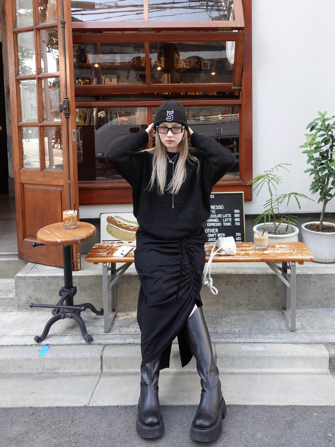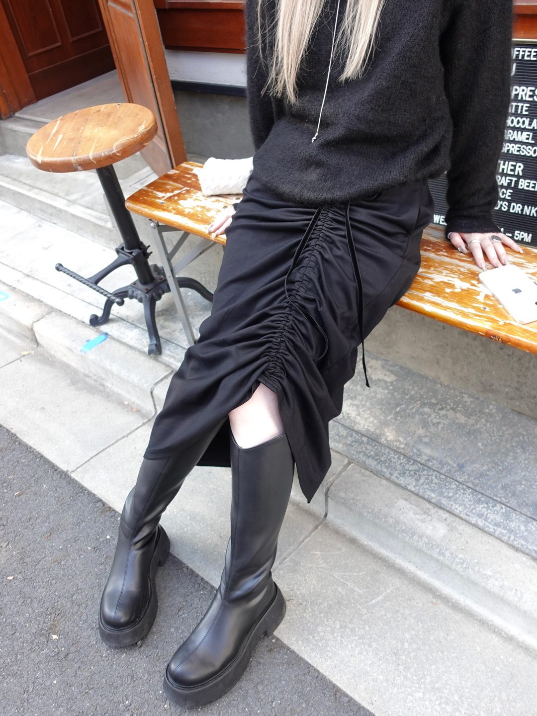 素材が艶やかで非常に履き心地が良いので、通年通して着用したいアイテム。ウエストの紐を絞ることで、ギャザーのデザインを好みに合わせて調節できるところがお気に入りです。今回はブーツと合わせましたが、カラータイツなど足元にポイントを持っていきたいときにぴったりの一着です!