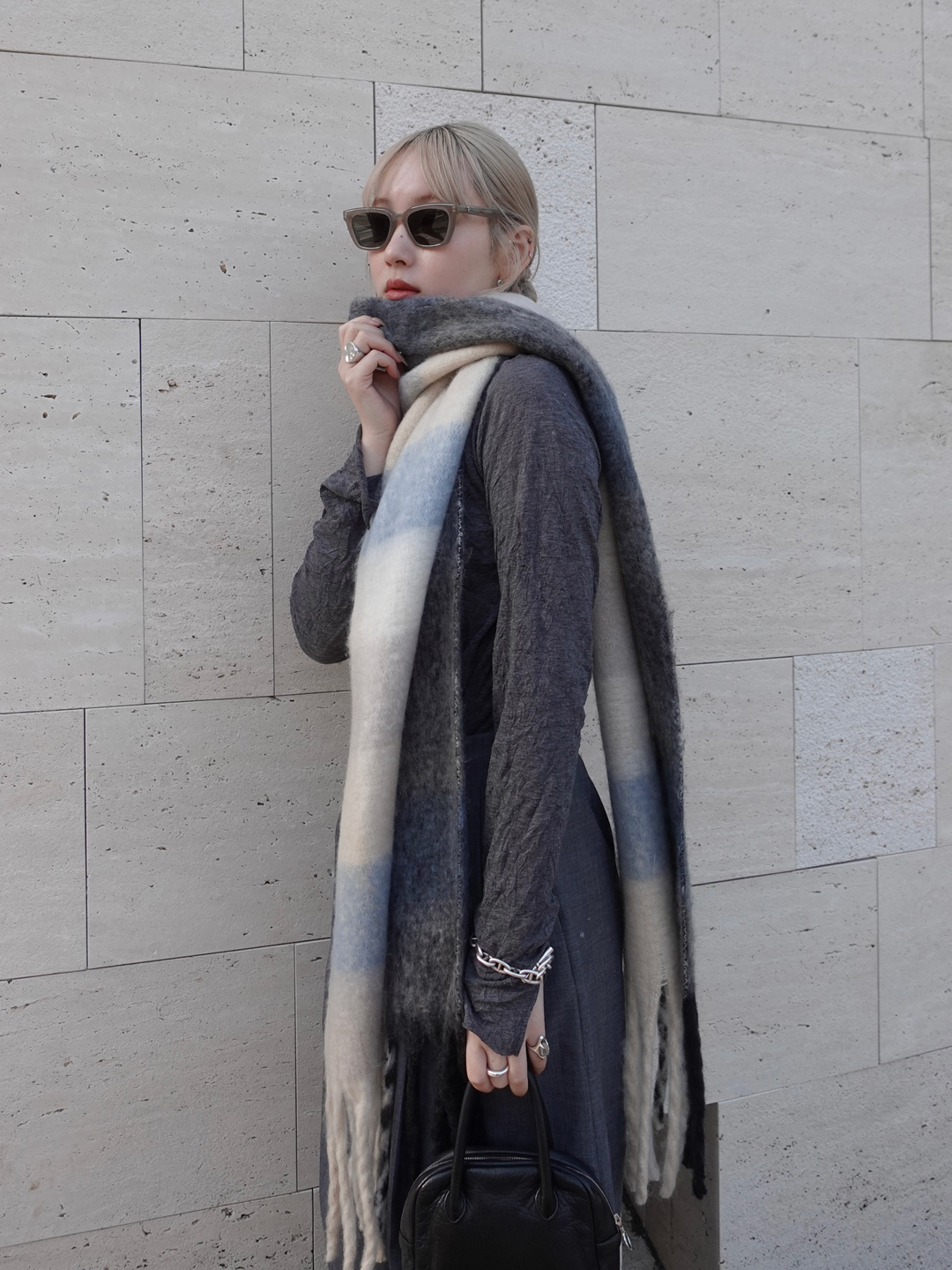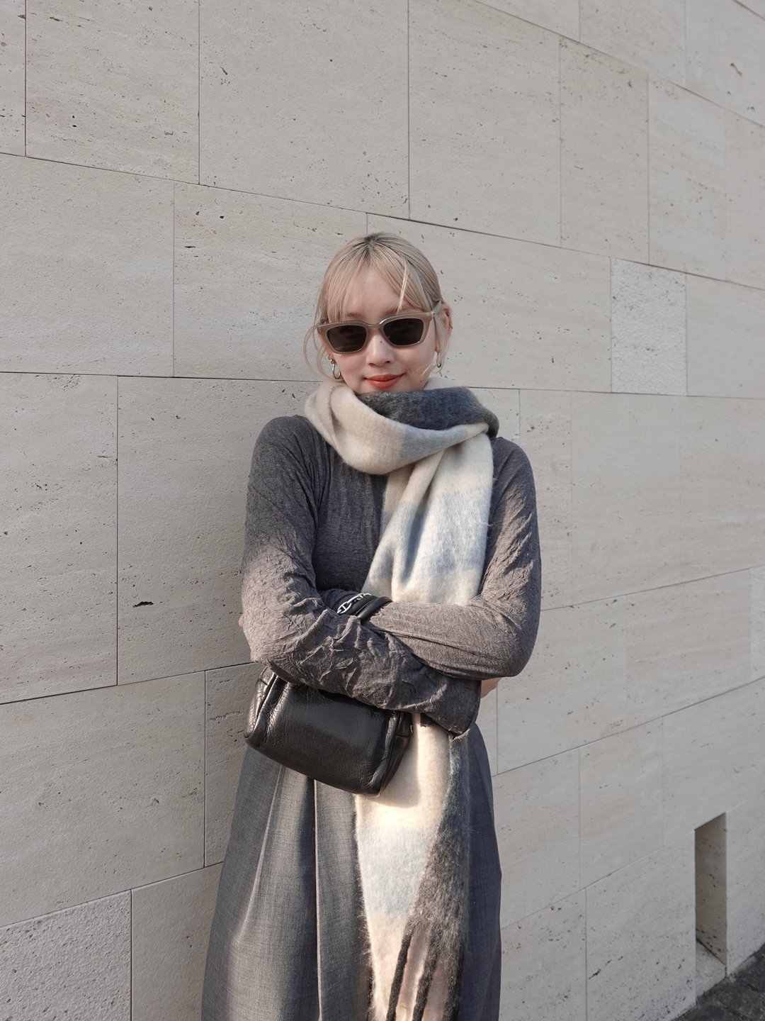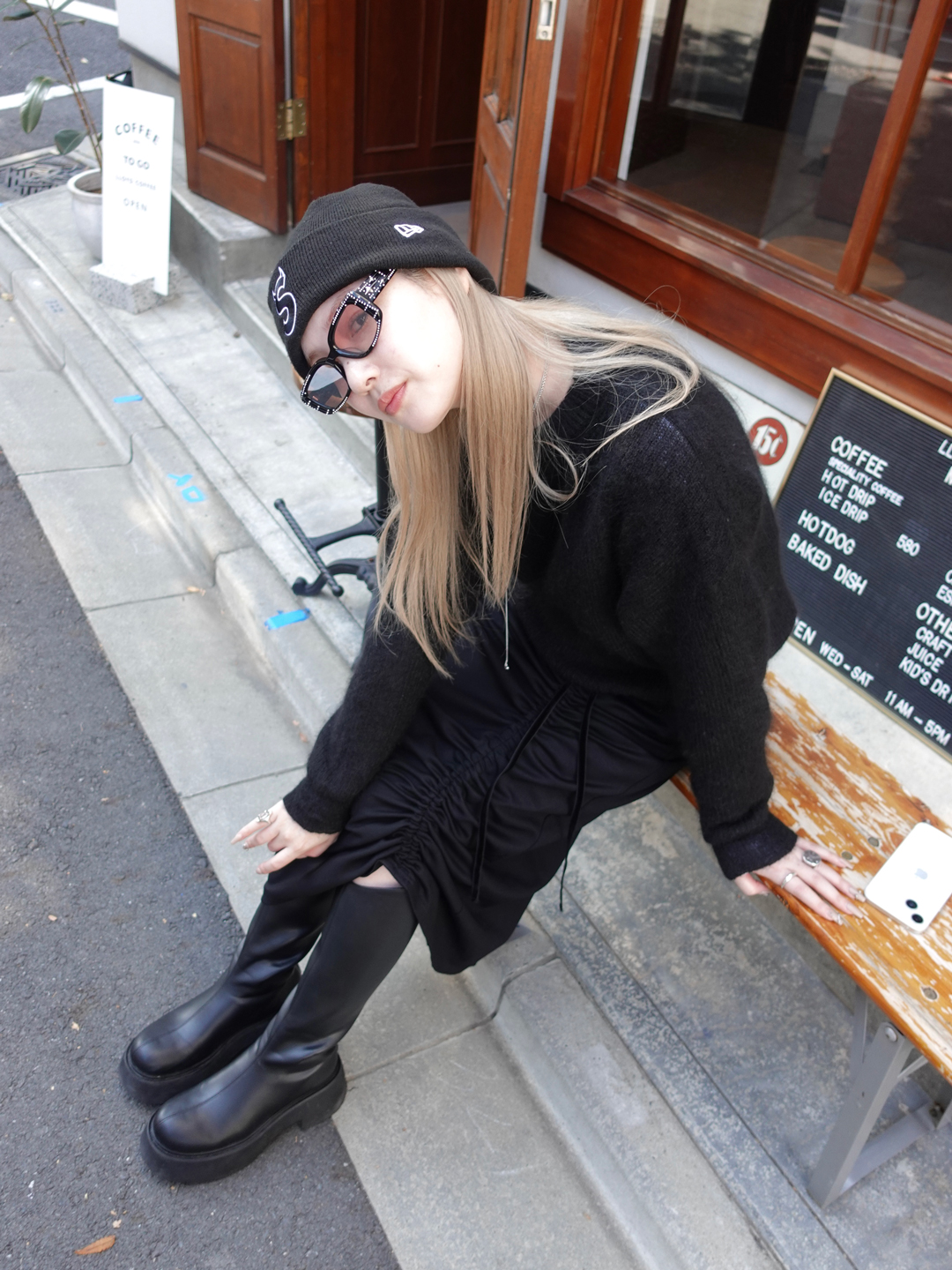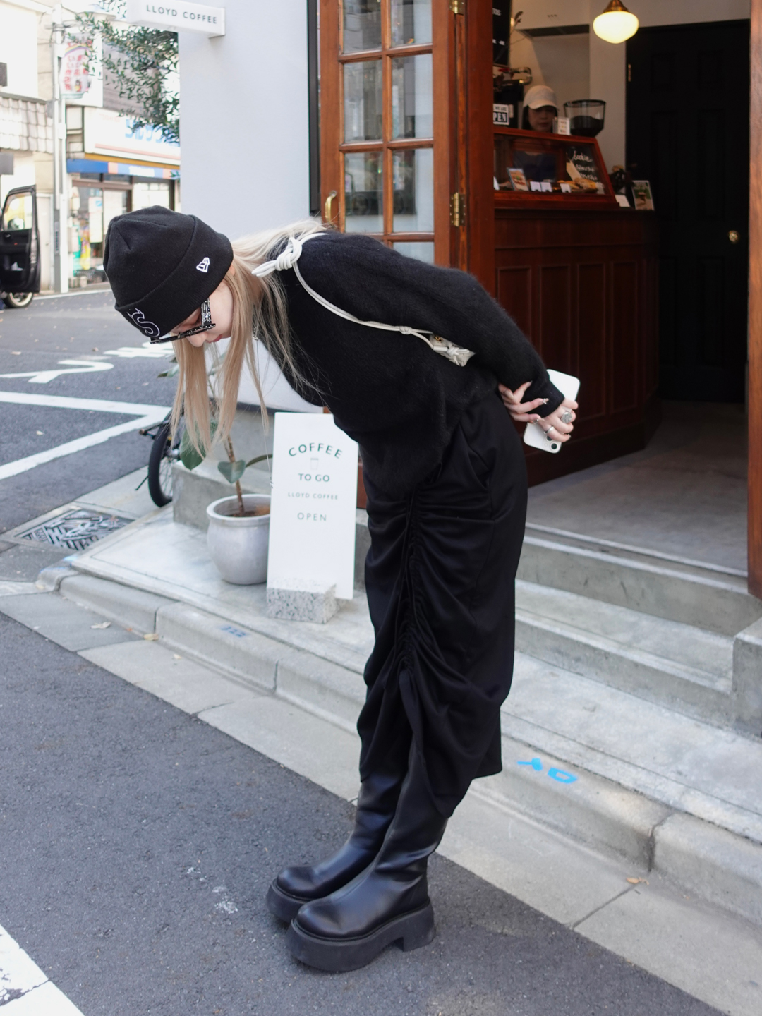 素材が艶やかで非常に履き心地が良いので、通年通して着用したいアイテム。ウエストの紐を絞ることで、ギャザーのデザインを好みに合わせて調節できるところがお気に入りです。今回はブーツと合わせましたが、カラータイツなど足元にポイントを持っていきたいときにぴったりの一着です!