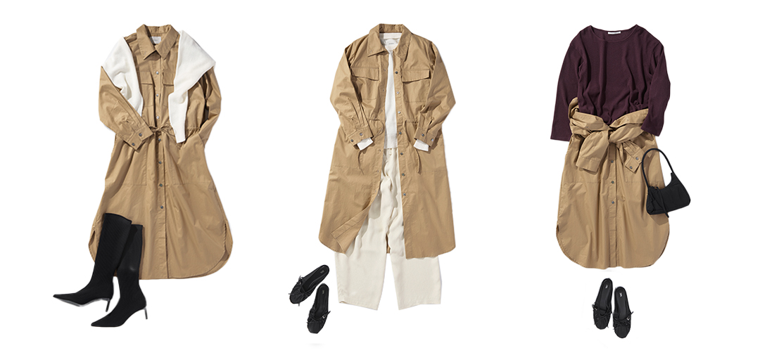 ミリタリー調のメンズライクなディテールと女性らしさが融合したワンピース。まずはスタンダードな着こなしで。マニッシュ要素のあるパーツに対して、レディライクな小物などが好相性でコントラスト楽しめます。どんな色味とも親和性の高いベージュは、着回しに重宝する一着。