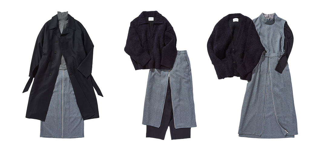 Wジップを施したモードな印象のスカートをベースに、シャープなイメージを活かして、モノトーンの着回し術をご紹介します。組み合わせ方やレイヤードのアイデア次第でいろんなアレンジを効かせられる、使い勝手の良いデザインのスカートです。