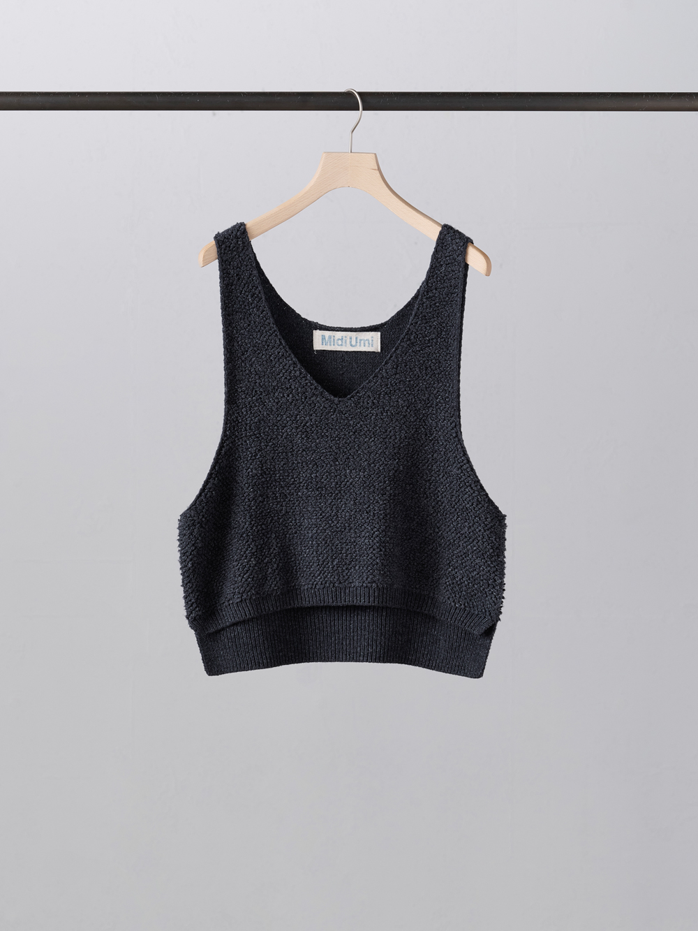 裾には前後差をつけてあり、着たときに後ろ下がりに見えるデザイン。スリット入りで前後でリブの幅を変えている細やかなディテールも魅力です。