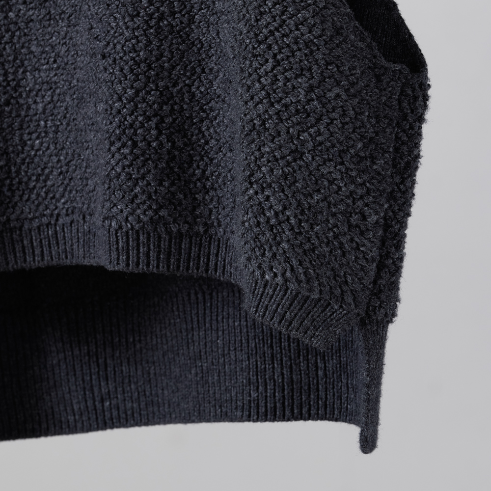 もっちりとしていて心地よい肌触りのパイル風のボアニットが印象的。ふっくらとした包み込むようなやさしい触感と、身幅にゆとりのあるサイジングがラフなスタイリングに似合います。スカート&パンツどちらとも相性が良く、リラックスしたスタイルに取り入れたいアイテムです。