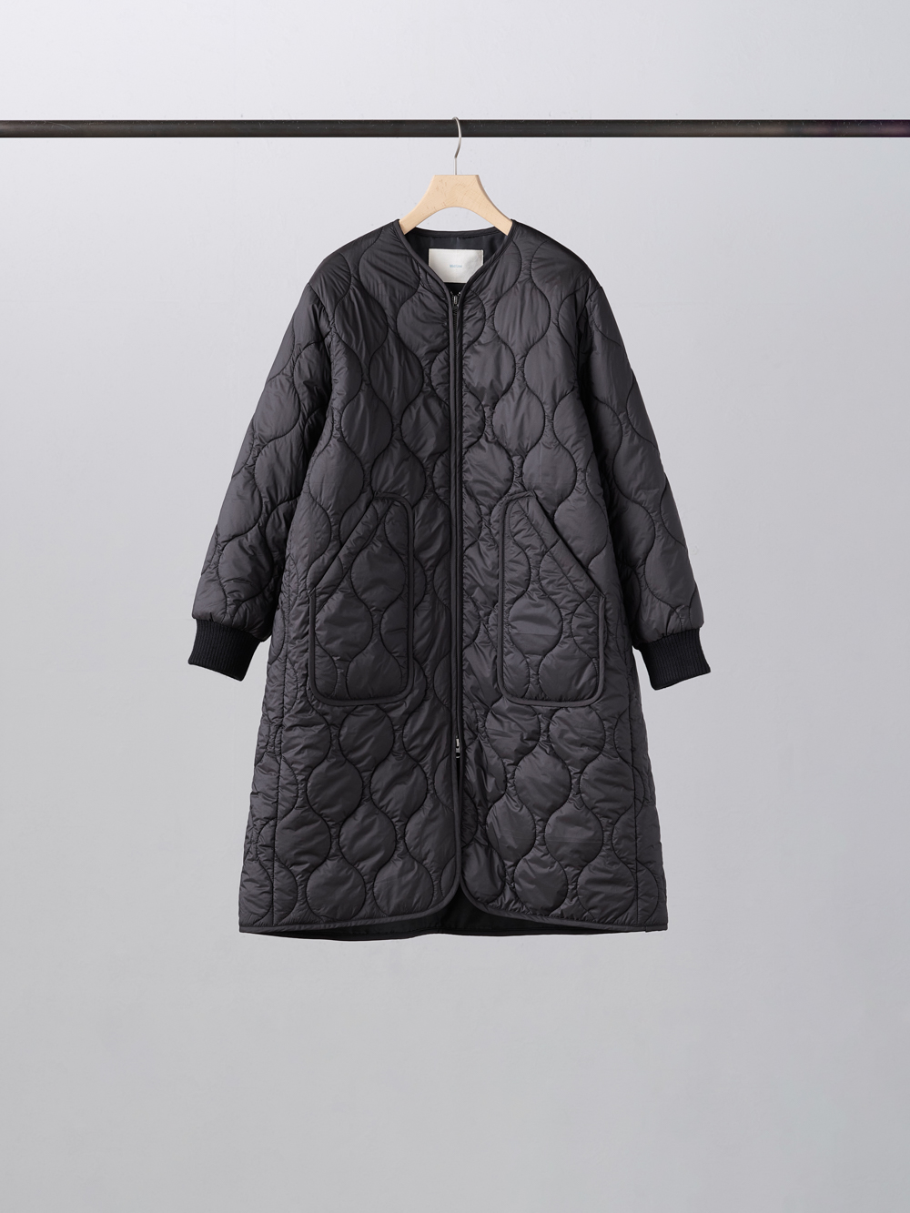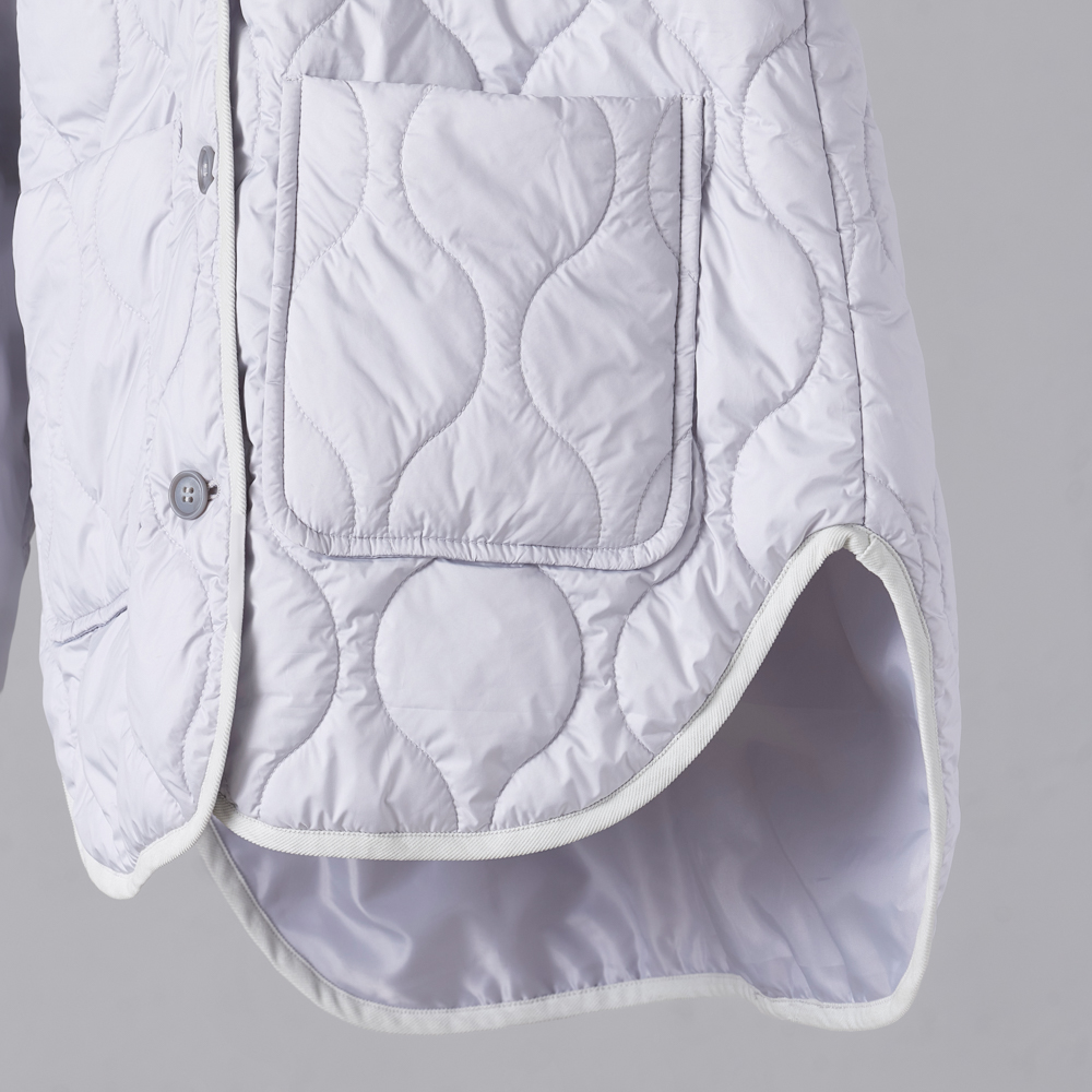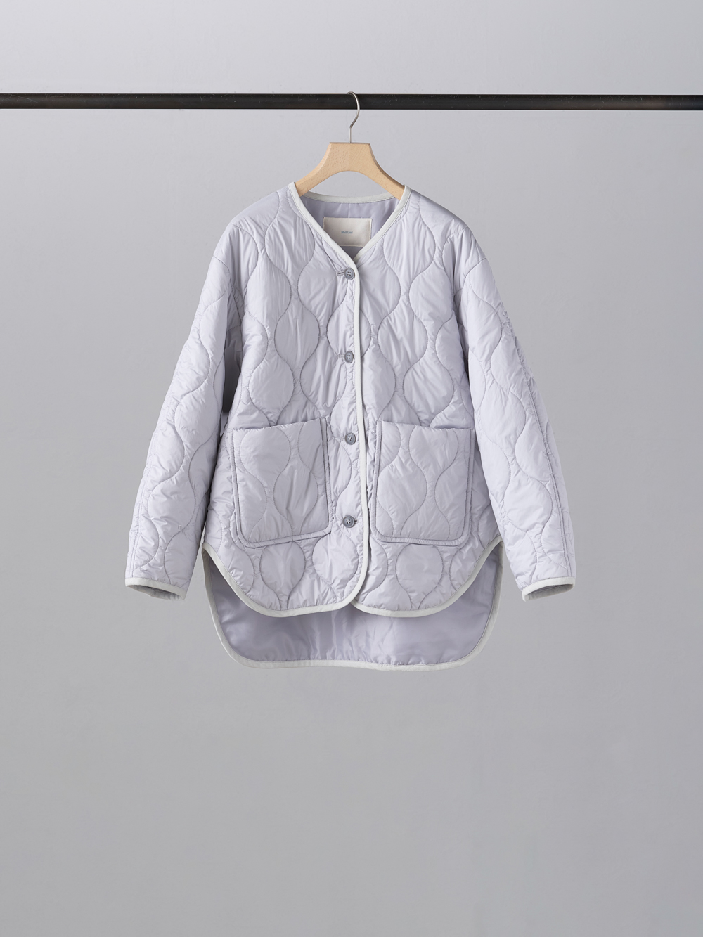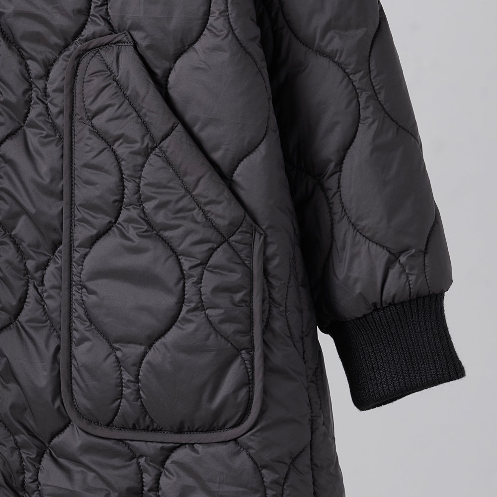 MidiUmiの秋冬シーズン定番のキルティング素材を使ったアウターです。中綿にはポリエステル素材を採用していて、軽さと暖かさを兼ね備えているのが人気の秘訣。やや丸みを帯びたコクーンデザインの袖も、細かなこだわりポイントです。縁のパイピングもアクセントになっています。
