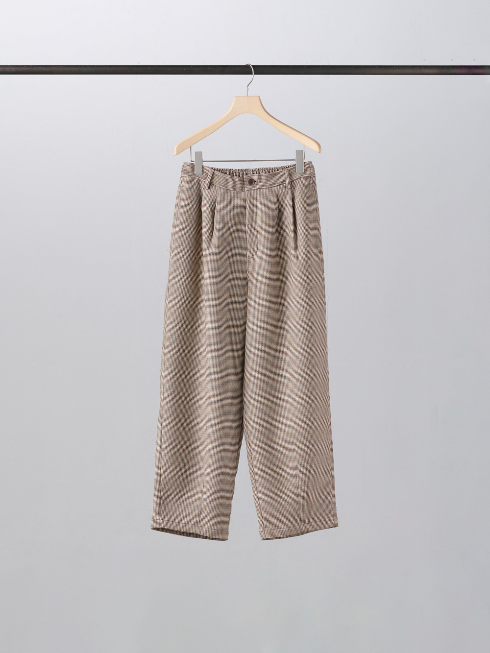 やや光沢感のある上品なテクスチャーのストレートシルエットです。フロントは両側にタックが1ヶ所ずつ入っていて、ボタン&ジップ仕様のキレイめですっきりした見映え。ゆとりがあり小慣れた雰囲気のサイズ感にプラスして、裾の部分にダーツを施してあり今どきっぽいニュアンスも取り入れています。
