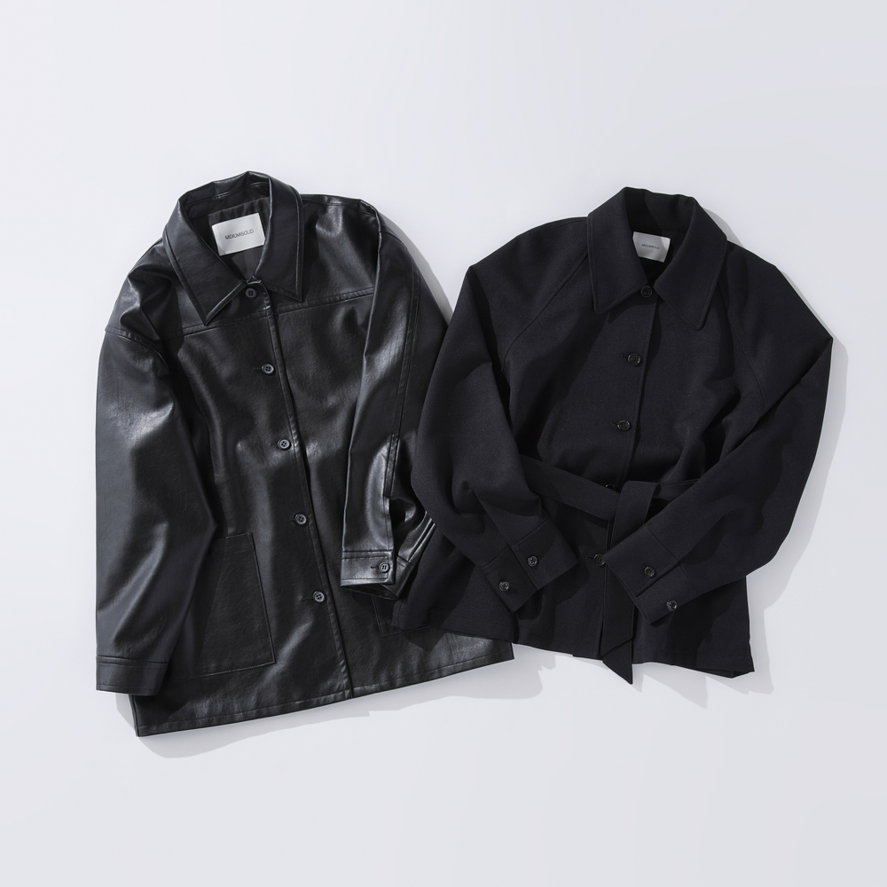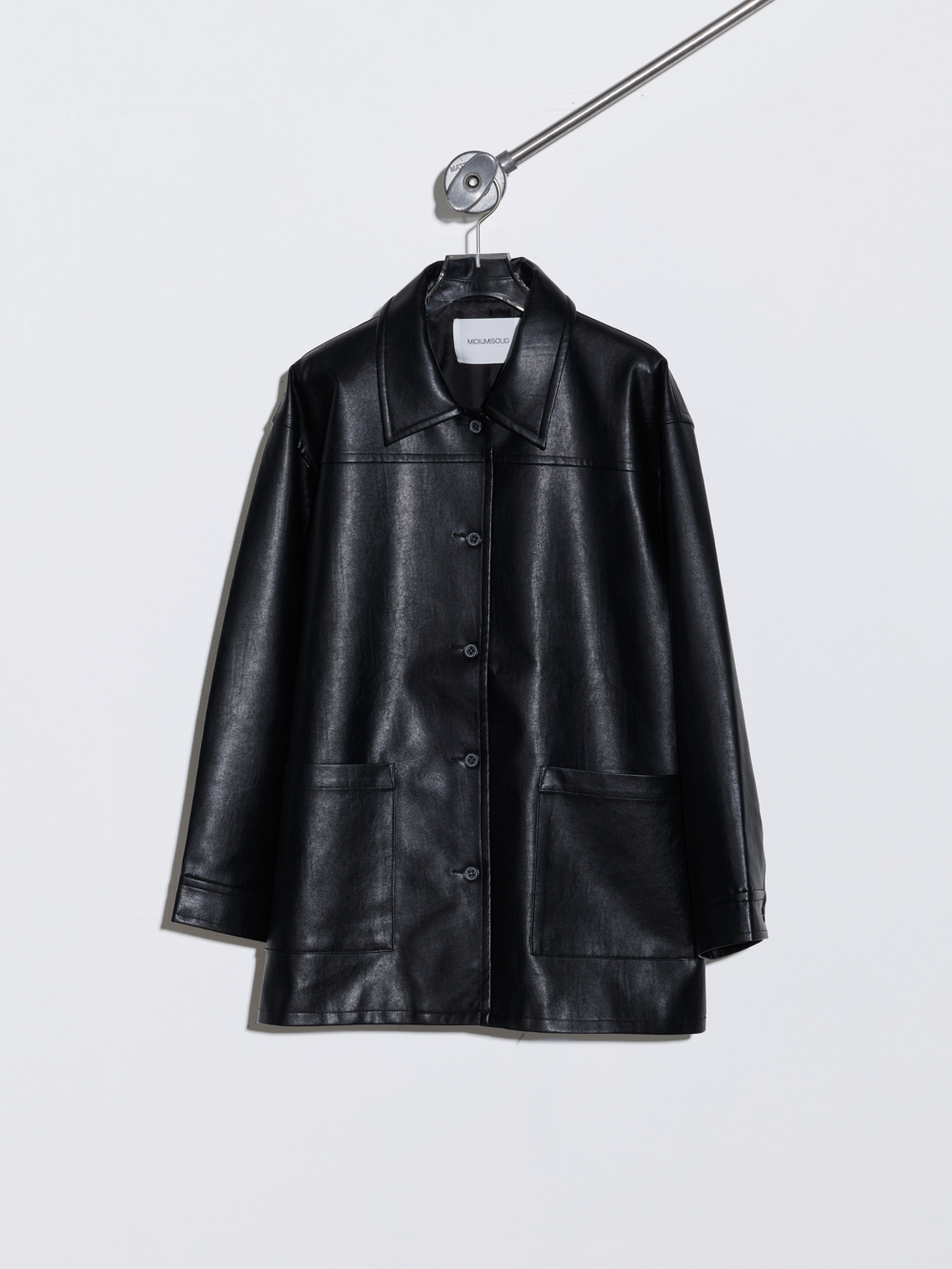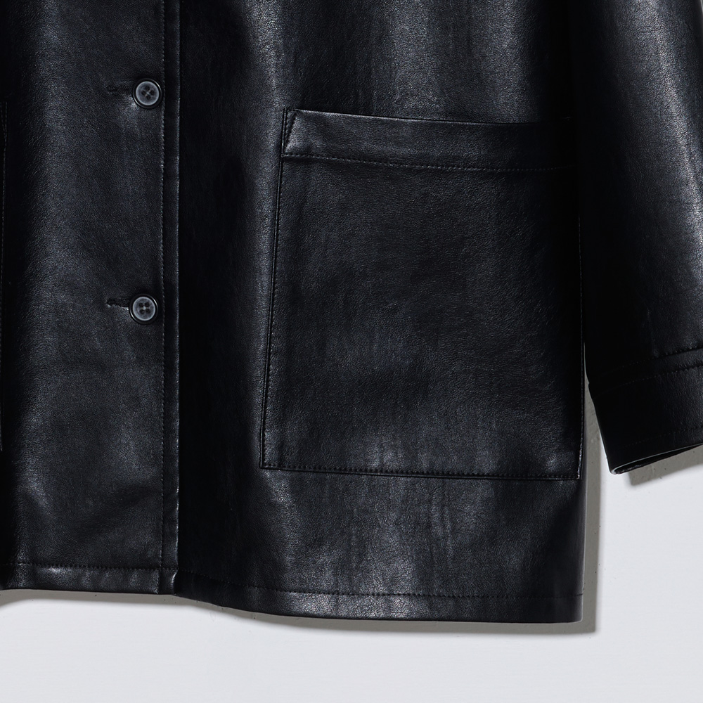 シンセティックレザーを使用したアウターは、引き続きトレンドアイテムのひとつ。光沢感のあるスクエアなシャツジャケット風デザインで、両側のポケットもアクセント。スタイリングのテイスト次第でインナーとの組み合わせも自在の合わせやすいアウターです。メンズライクなオーバーサイズが今っぽい。軽量でお手入れが簡単なのも魅力のひとつです。