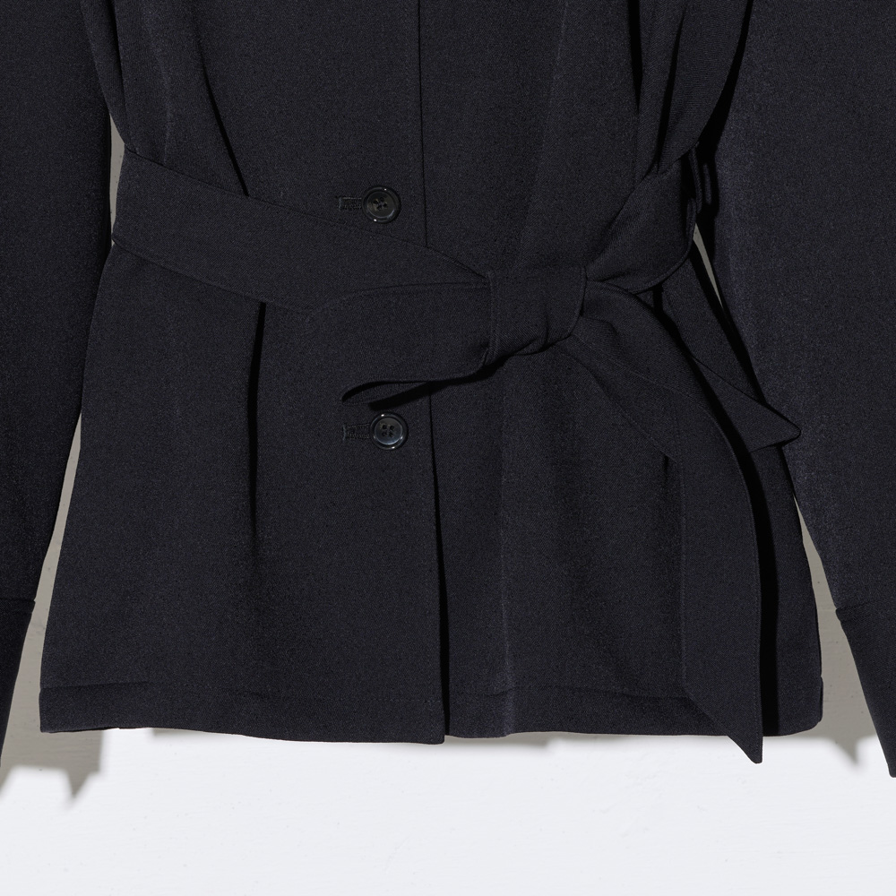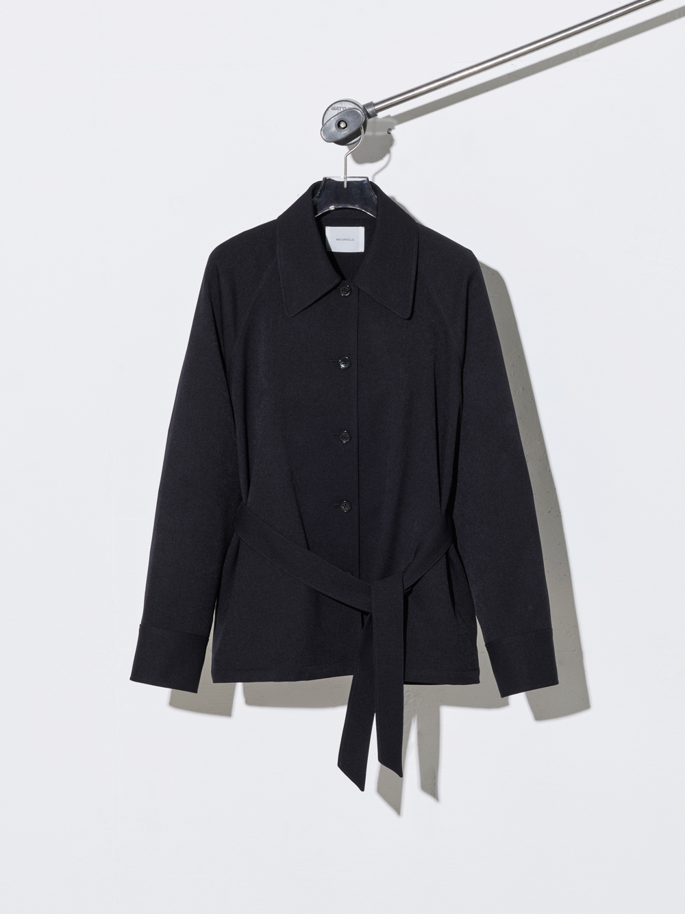 光沢のある薄手のウール素材をシャツ仕立てにした軽量アウターです。大ぶりの襟に、取り外しのできるウエストベルト付き。フロントの開閉や着こなし方次第で印象を変えられます。袖口はシャツのようなカフスデザインでボタンが2ヶ所につき、調整することができます。