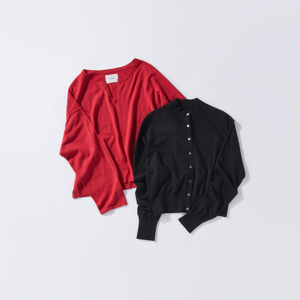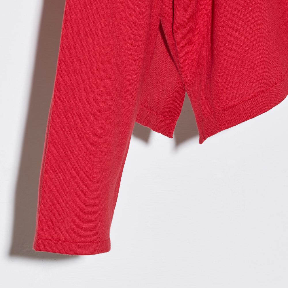 鮮烈な赤が着こなしのポイントになってくれるカラーリング。着丈は短めで今っぽいコンパクトなシルエット。薄手のニットなのでウエストインしてもすっきり着こなせます。変則的なキーネックを胸元にあしらい、スタンダードなクルーネックとはひと味違った印象を演出してくれます。