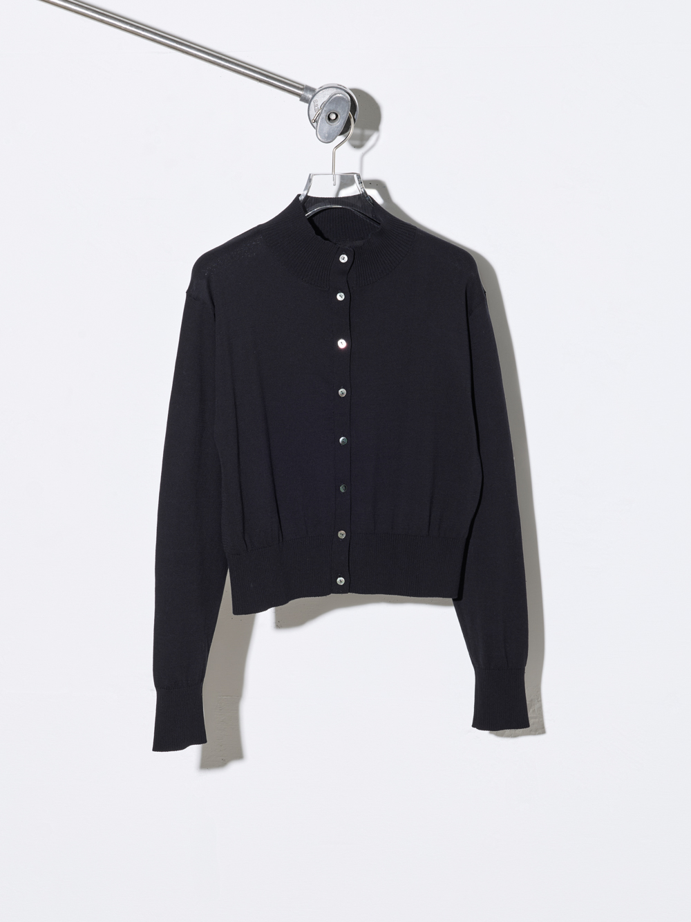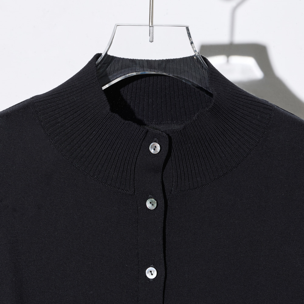 スムースな質感のコットンニットを使用しているので肌触りなめらかで上質な見栄え。襟元、袖口、裾に太めにリブをあしらい、ほどよくフィット感を高めてくれるので上半身がすっきり見える形です。ややハイネック気味にデザインされている高さのある襟元がエレガントな印象に。