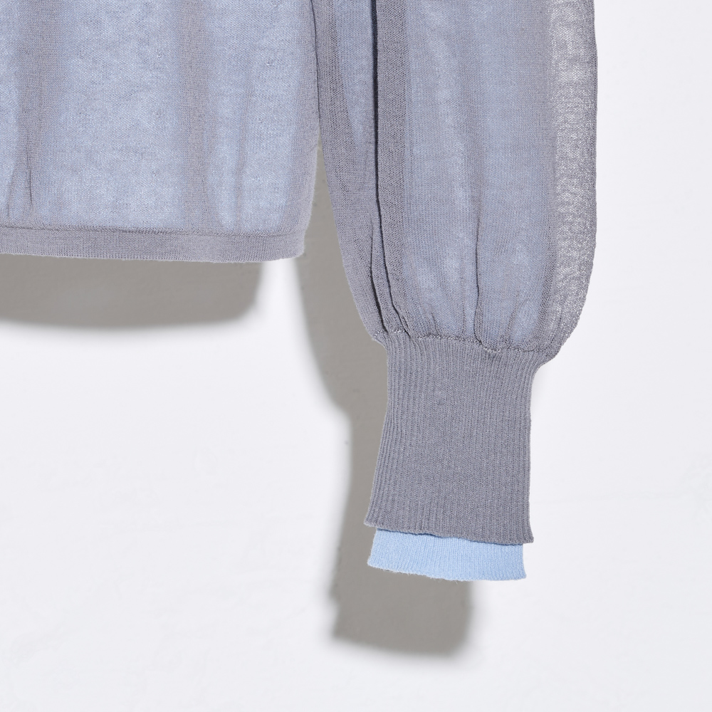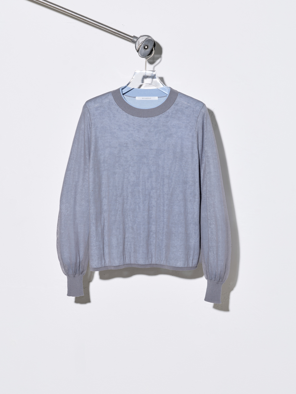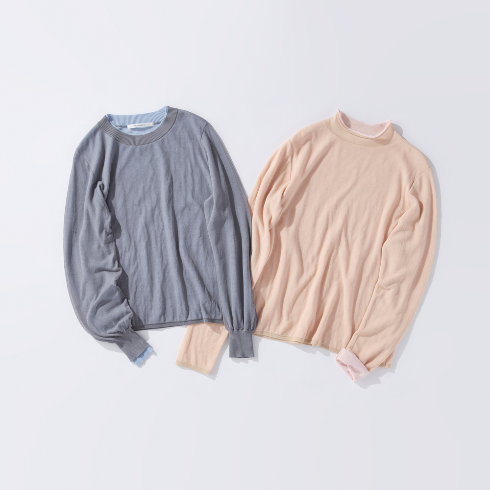 内側のブルーがシアーな表の素材からのぞく、絶妙なレイヤリングのカットソーです。素材が二重に重なることで、透け感とともに色味が変化。クルーネック部分のリブは内側のブルーがチラリと見える設計になっています。袖のみ表と内側の素材を縫い合わせていないので、袖口のリブから内側のカットソーの見え方を調整することができます。