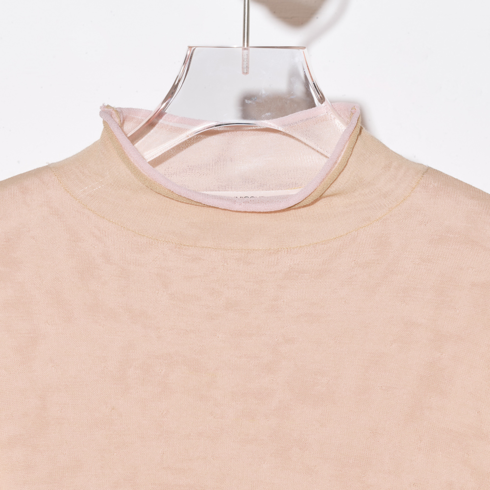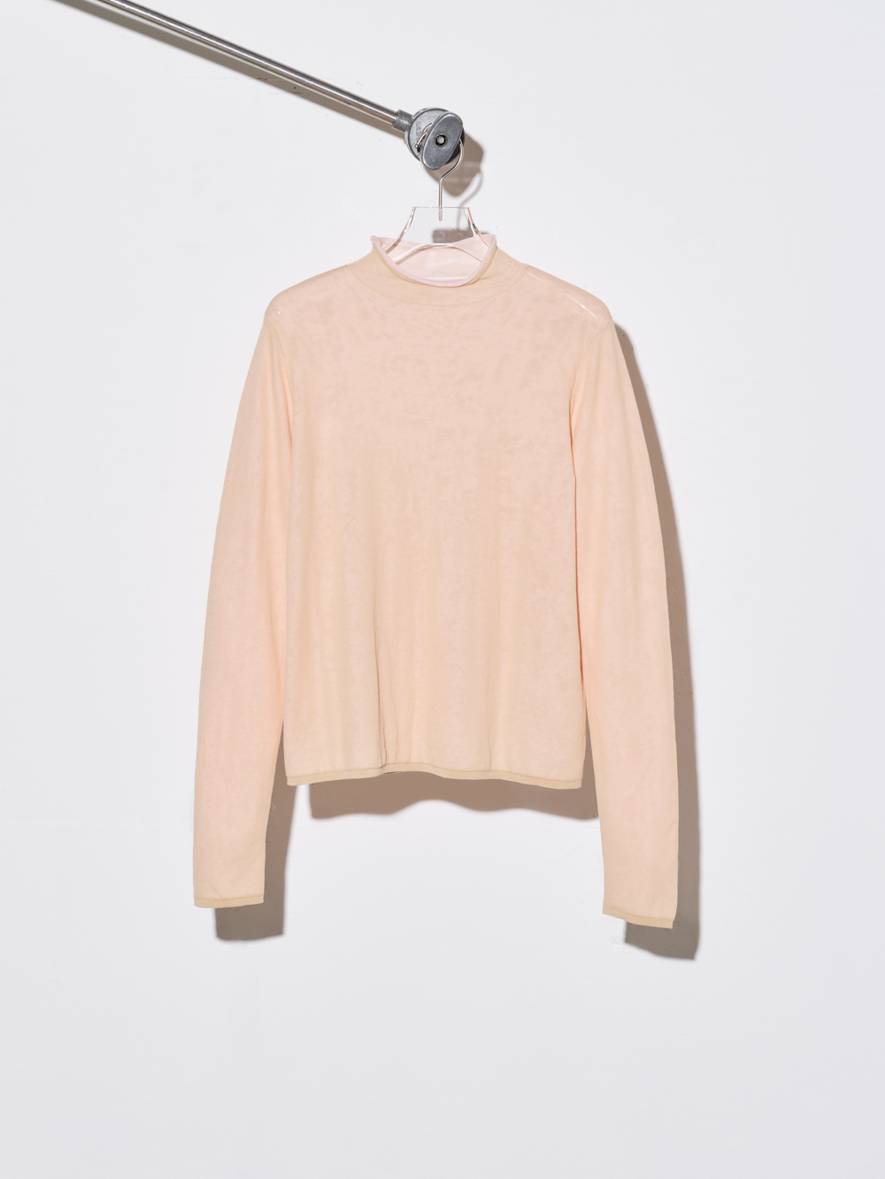やわらかで繊細なシアー素材と内側の素材を縫い合わせ、1枚仕立てにしたカットソー。1枚で重ね着しているような見た目と、シアーな抜け感のある雰囲気を演出することができます。襟元のハイネック部分のみ素材を縫い合わせず、色味がちらりとのぞく遊び心のあるデザインです。