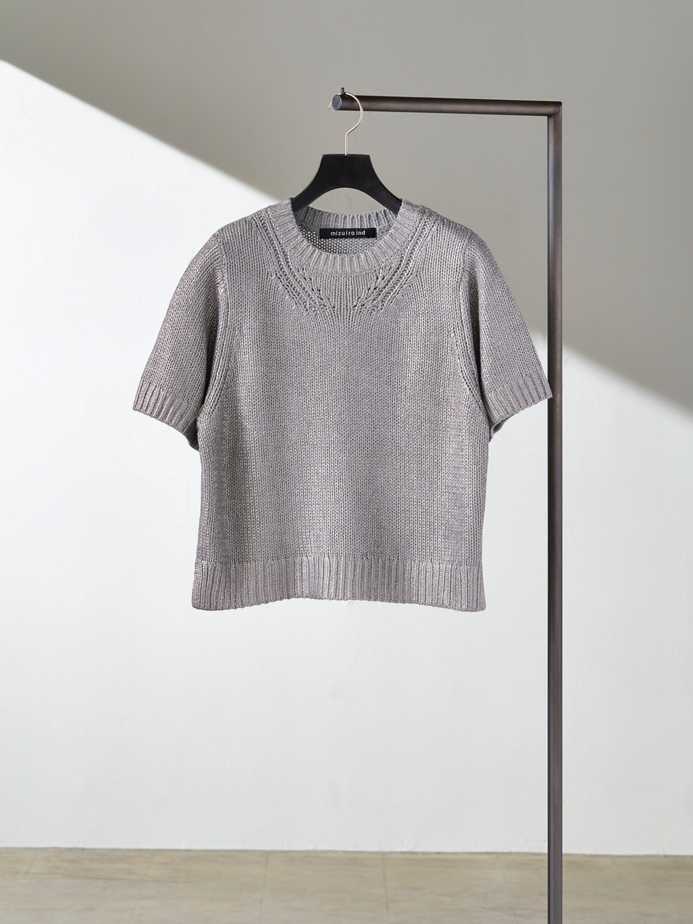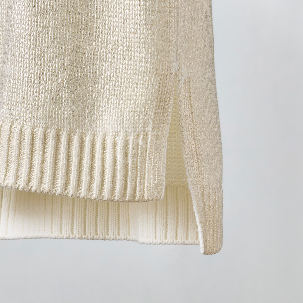 コットン混紡のニットに、箔プリントをのせた存在感のある素材です。きらめく光沢がラグジュアリーな上品さを演出するとともに、洗練されたカッコ良さも備えているデザイン。首元のハイネックも秋冬らしさを盛り上げてくれるパーツです。長袖、半袖どちらに重ねても着こなせます。