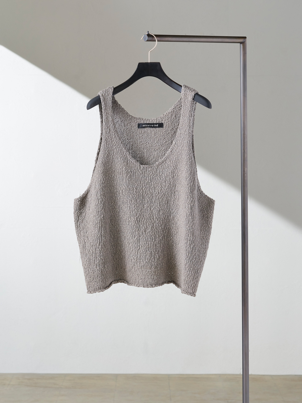 ループ状に織られたパイル地のような特徴的な素材使いです。キャミソールをイメージしたデザインで、肩のストラップ部分は華奢な作りに。アームホールを広くとってあるので、袖幅が広いインナーとも相性良く重ね着できる着こなしやすさもあります。クラフト感のある素材も魅力です。