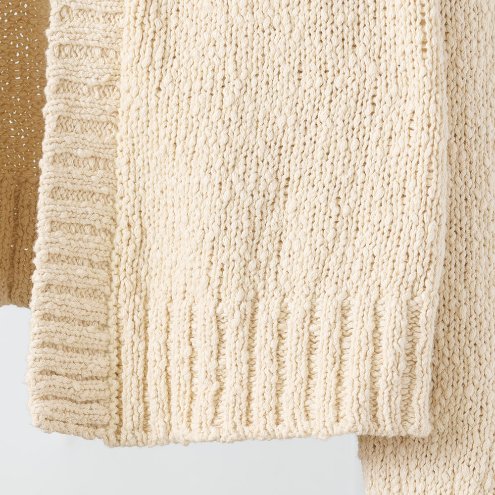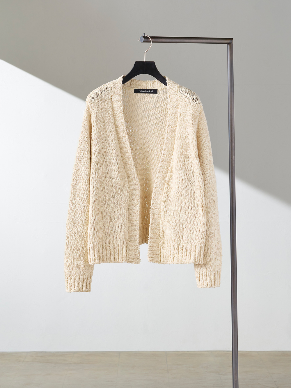 凹凸のあるスラブ感特有の風合いを感じられるニットです。フロントはボタンなどを付けず、さらっと着こなせるシンプルな作り。ウエスト下くらいまでの長すぎない丈感も着こなしやすいポイントです。肉厚なリリーヤーンの温かみのある質感が、デイリーなスタイリングによく似合うアイテムです。