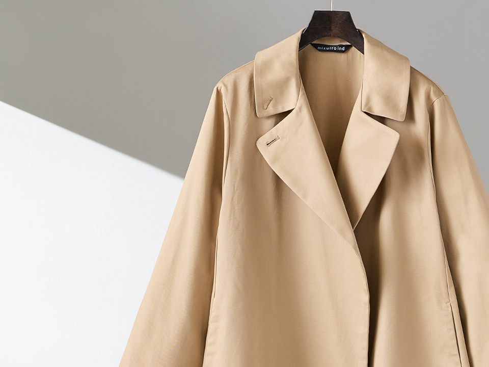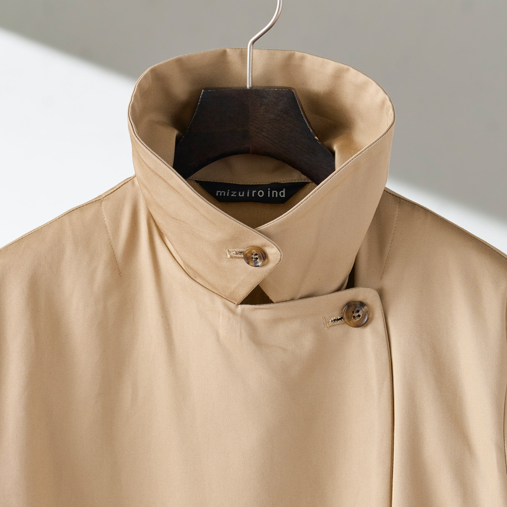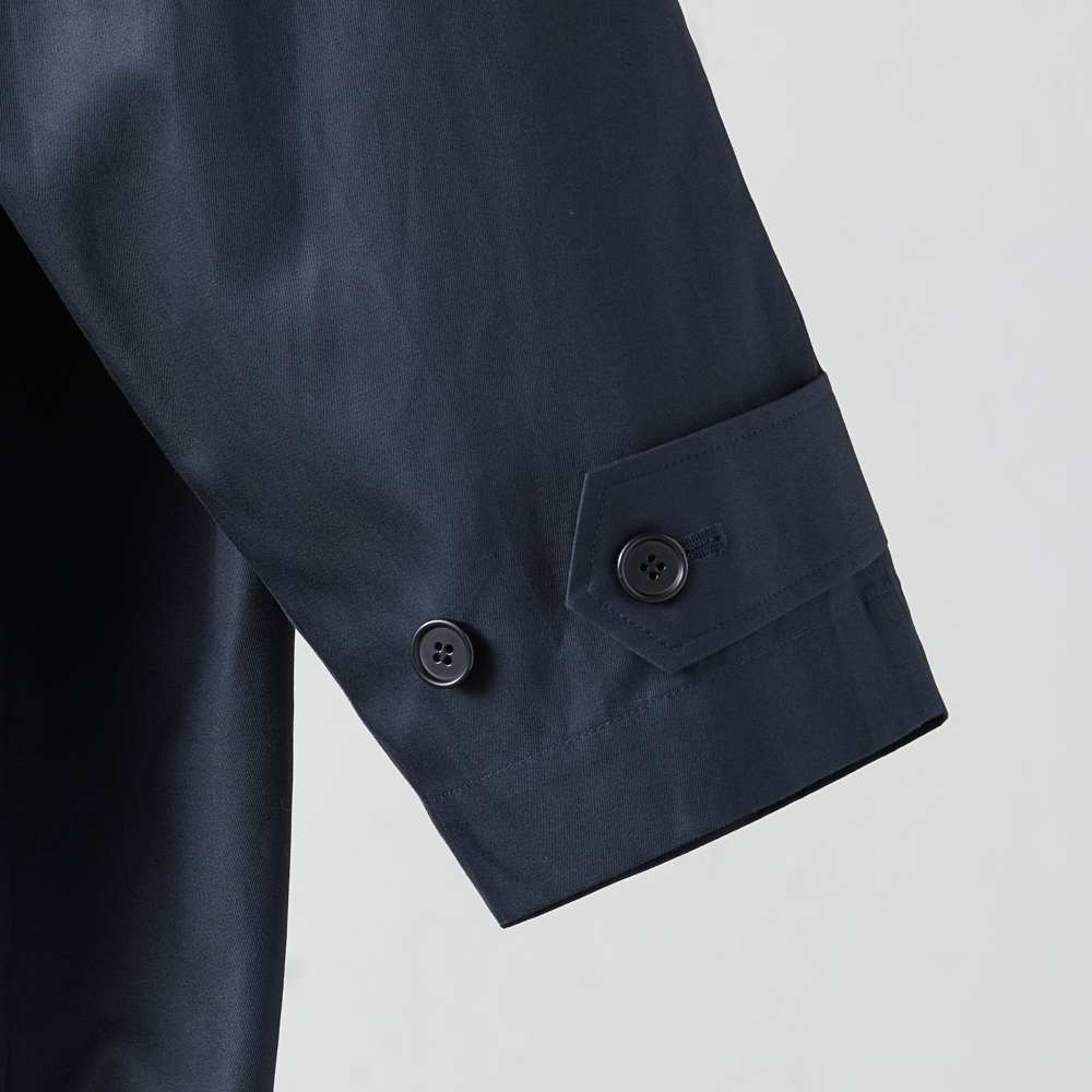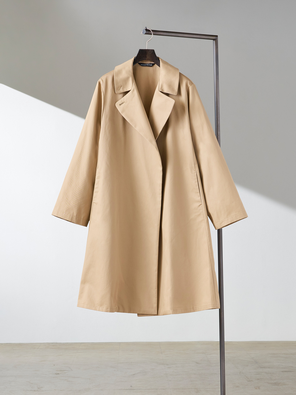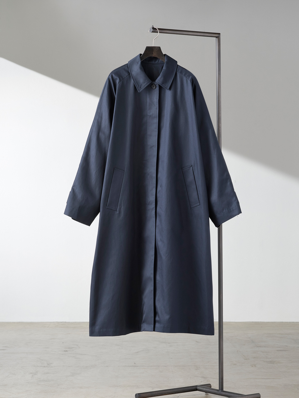 ハリのあるコットン素材を使った1枚仕立てのコートです。ボタンは首元と襟元にそれぞれ1ヶ所ずつ。トレンチライクな形をベースに、ムダなパーツを削ぎ落としたミニマルな仕上がりが魅力です。シーズンの変わる時期に嬉しい、軽やかで心地良く着られ飽きのこないデザイン。