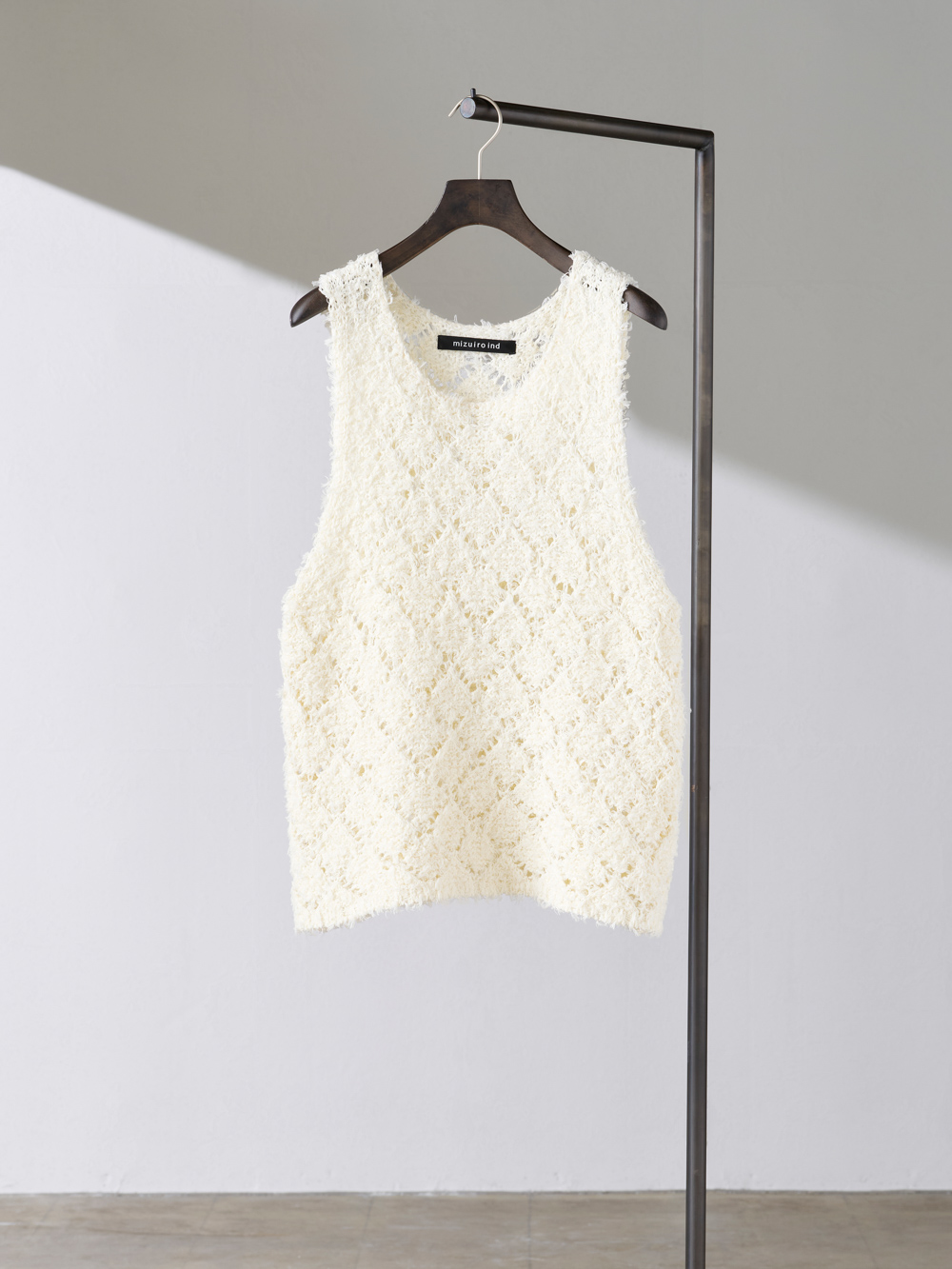 フリンジのついた起毛感のあるテープヤーン素材のベスト。ダイヤ柄に編み込んだ透け感のある編み地が、インナーとのレイヤードによってさまざまな表情になります。ヒップを覆うほどのやや長めの丈感は着こなしやすく、アームホールにはゆとりと持させているので重ね着するアイテムを選ばずスタイリングを楽しめます。