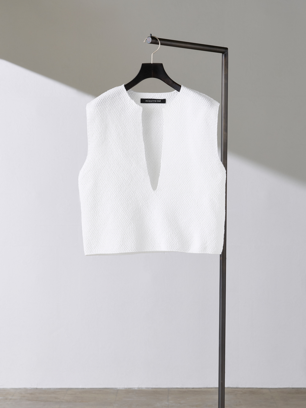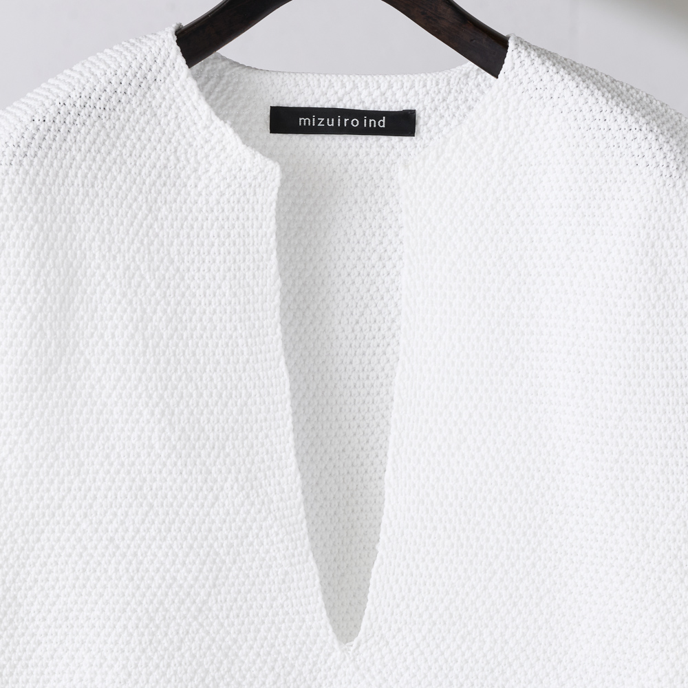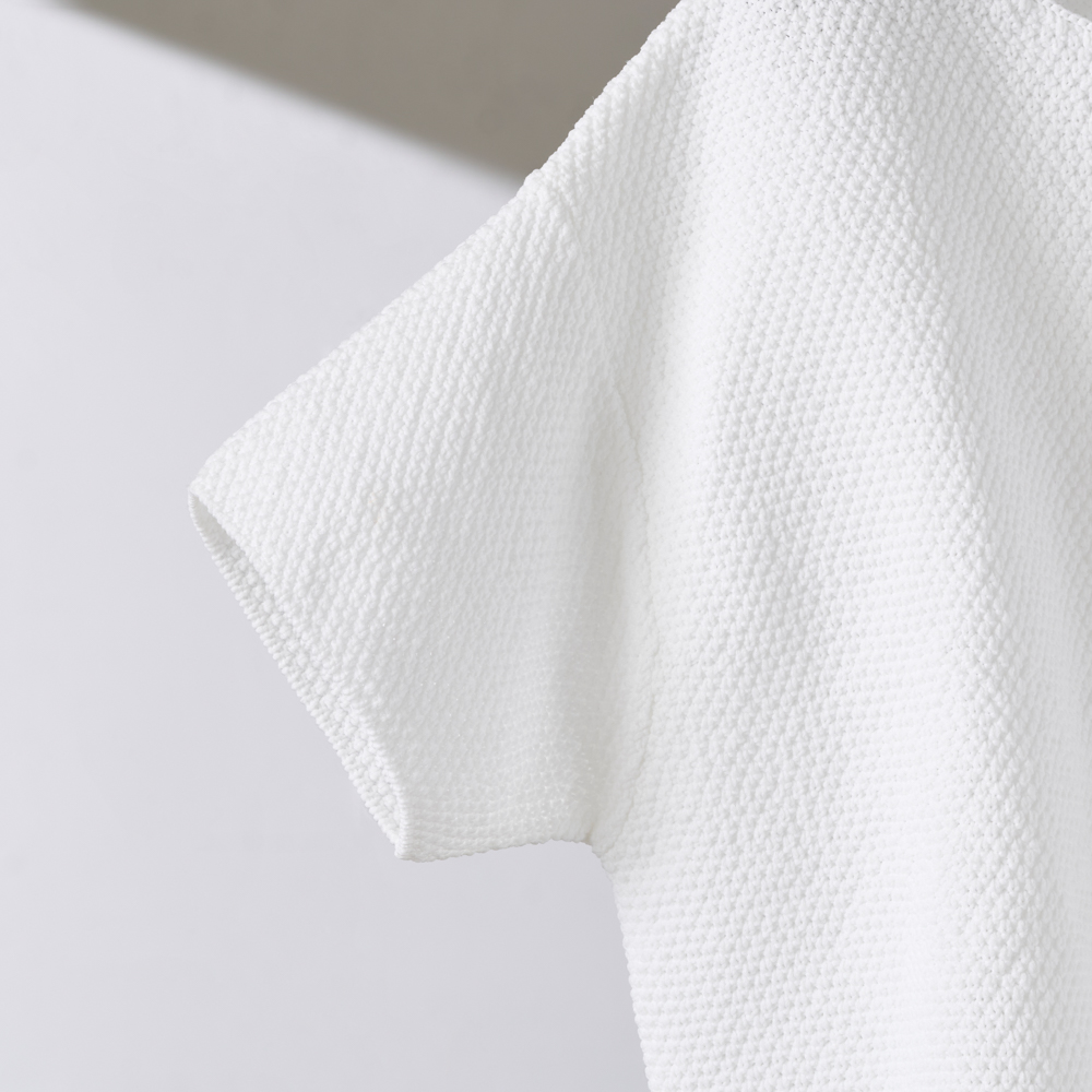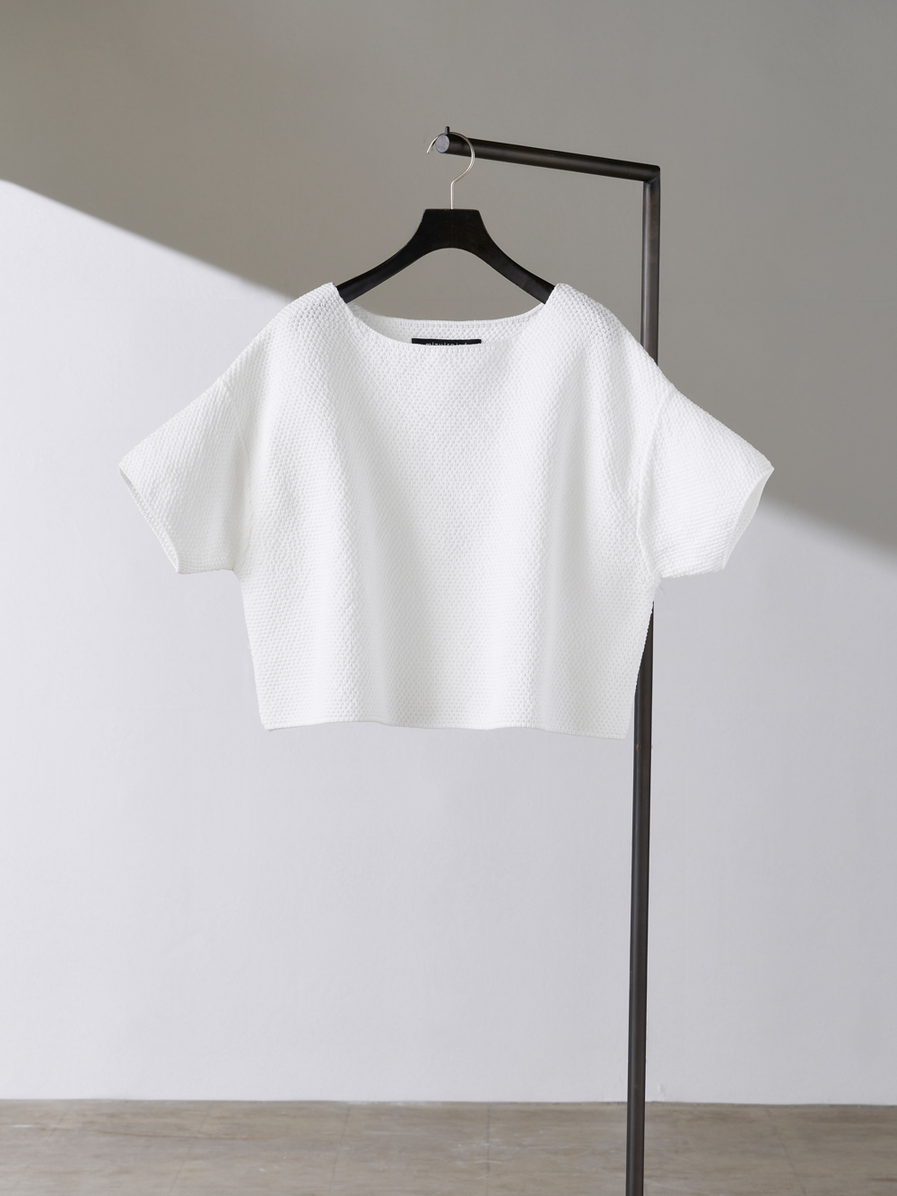 素材の表面に、小さくぽこぽことした立体感のある特徴的なスポンジリリーヤーン素材を使用しています。コンパクトでボクシーなシルエットが構築的で、深く入ったVネックラインも着こなしを印象的に。軽く速乾性がありストレッチが効いている、とても扱いやすい素材感も魅力です。