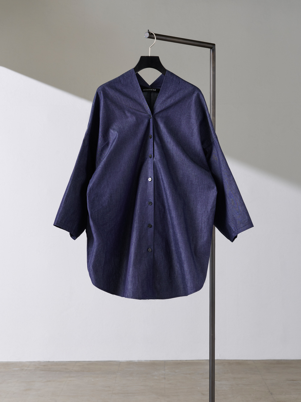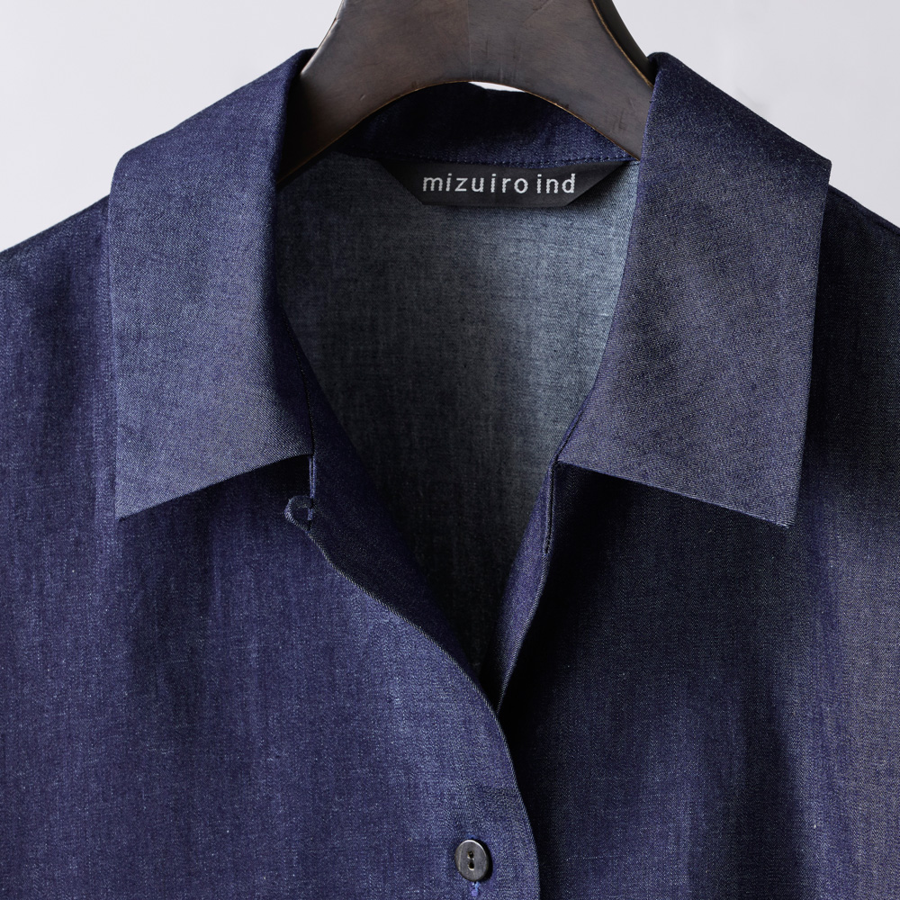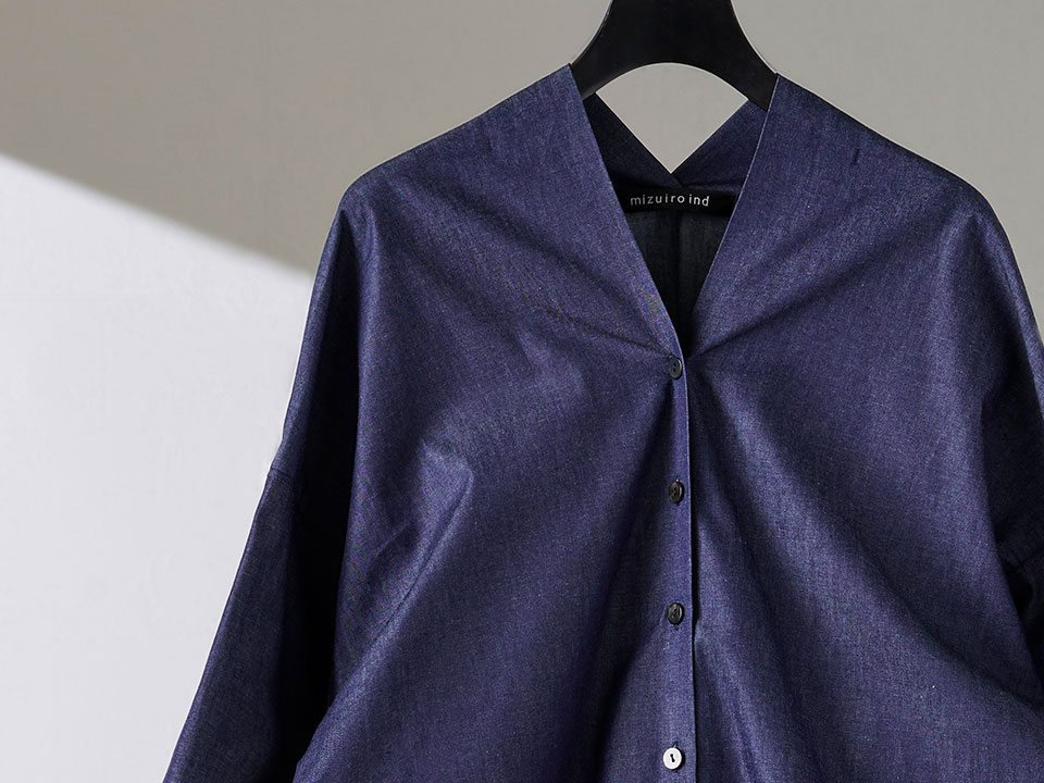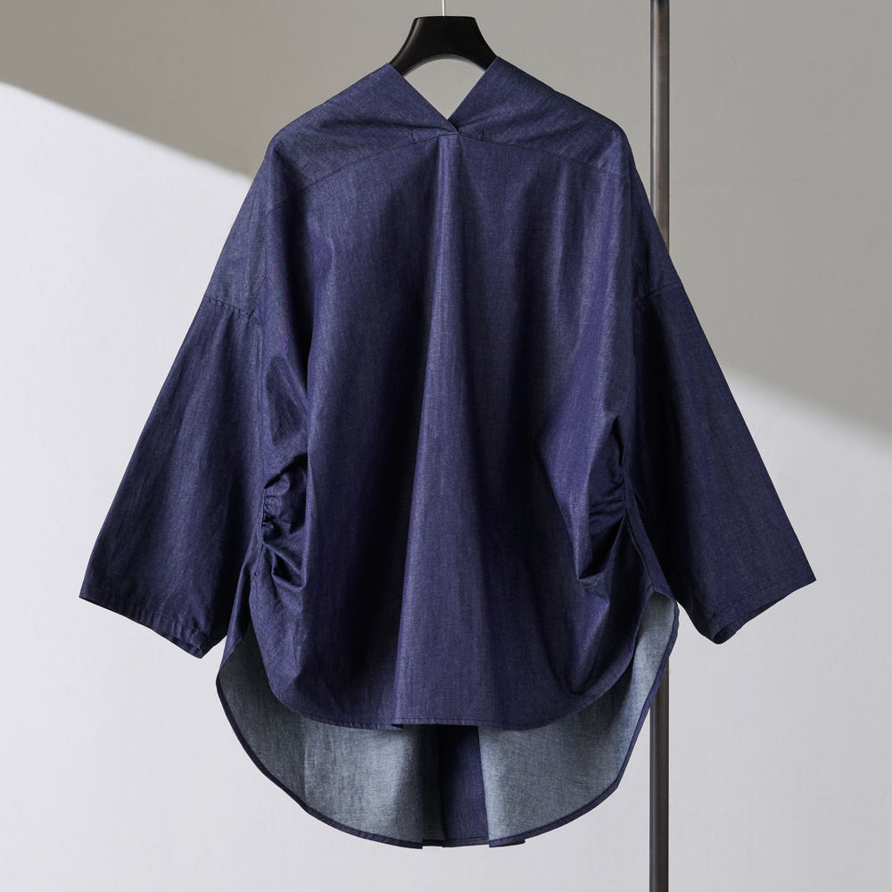 光沢感があり、キレイめな印象を演出できるデニム素材です。ノーカラーの首元が女性らしさとノーブルな雰囲気を感じさせるデザイン。4.5オンスと薄手のデニムで軽やかさがあり、着こなしやすくスタイリングが上品にまとまります。ドロップショルダーやタックなど、着たときに動きのある表情を見せる美しいデザインのシャツです。