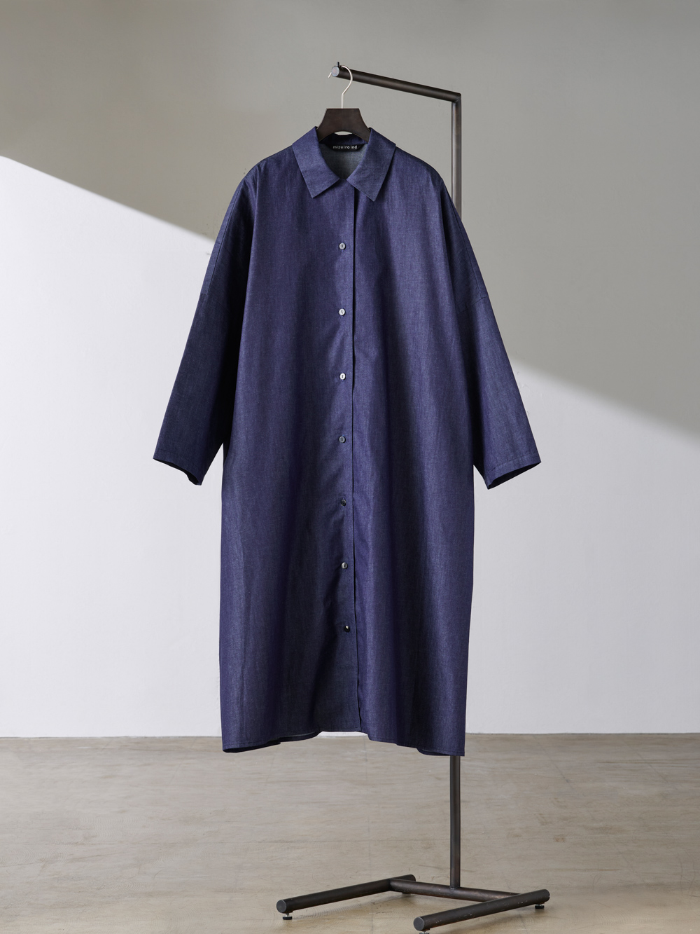 シャツと同様の4.5オンスの薄手のデニムを使用したシャツコートです。デニムのカジュアル感は控えめで、光沢感があるのでキレイめな印象に。さらっと軽やかに羽織れるライトオンスの扱いやすさもおすすめポイントです。裾の広がりのない縦のラインが美しいシルエットです。