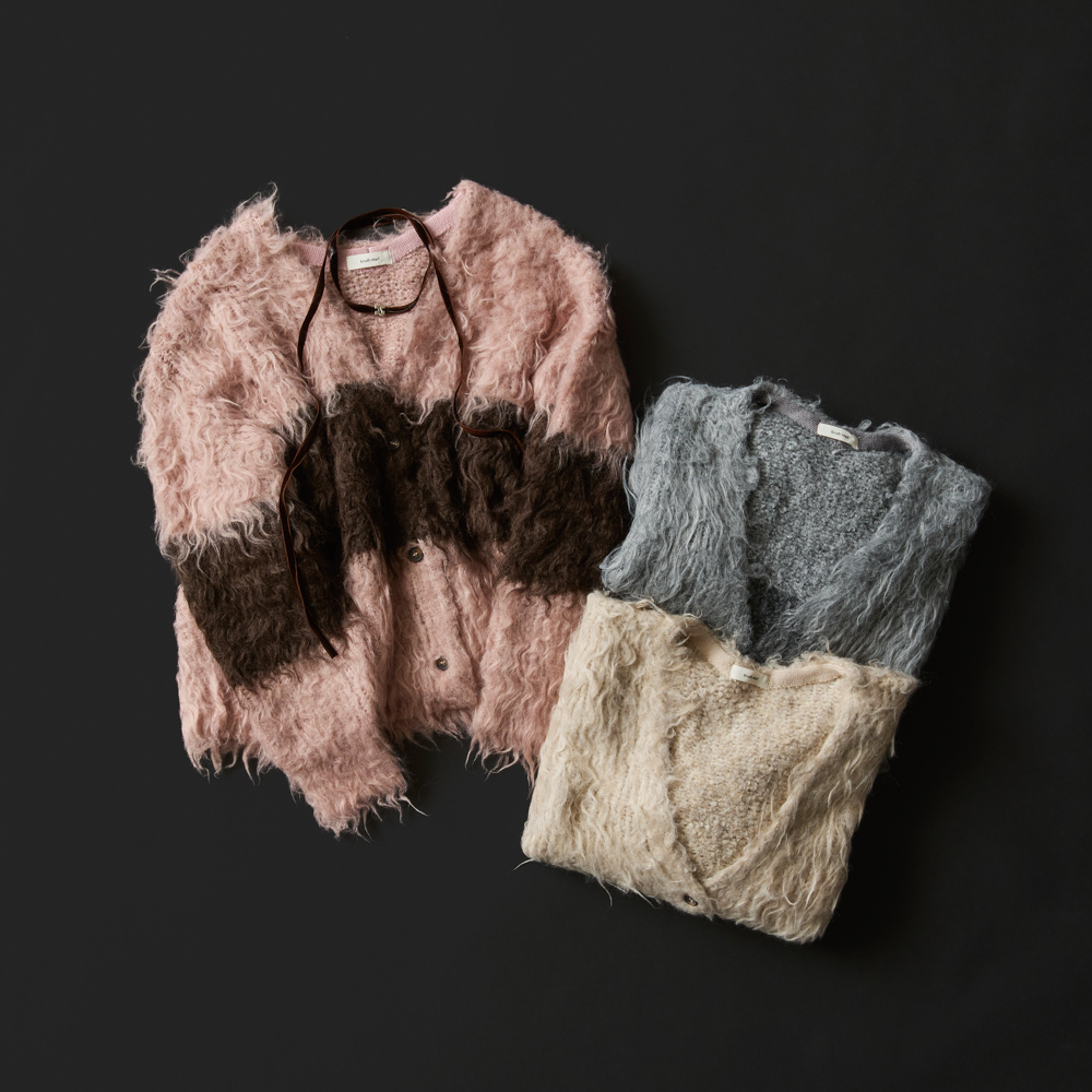 軽くてふわふわのシャギーな質感がかわいい、主張のあるデザインです。毛足が長く甘さのあるアイテムには、ニットの色によって変わるブラックorブラウンのチョーカーが付属します。ブランドの頭文字「K」モチーフのチャームもアクセント。遊び心を取り入れたデザインがギフトに最適。